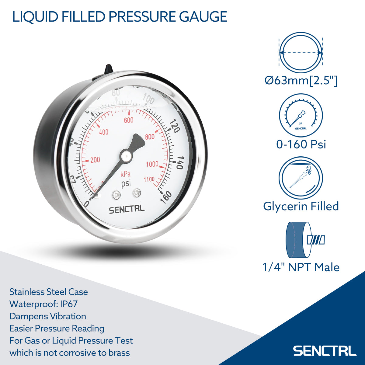 SENCTRL stainless steel 2.5 inch liquid filled pressure gauges provide great corrosion resistance. This model features a 1/4" NPT copper... Read more